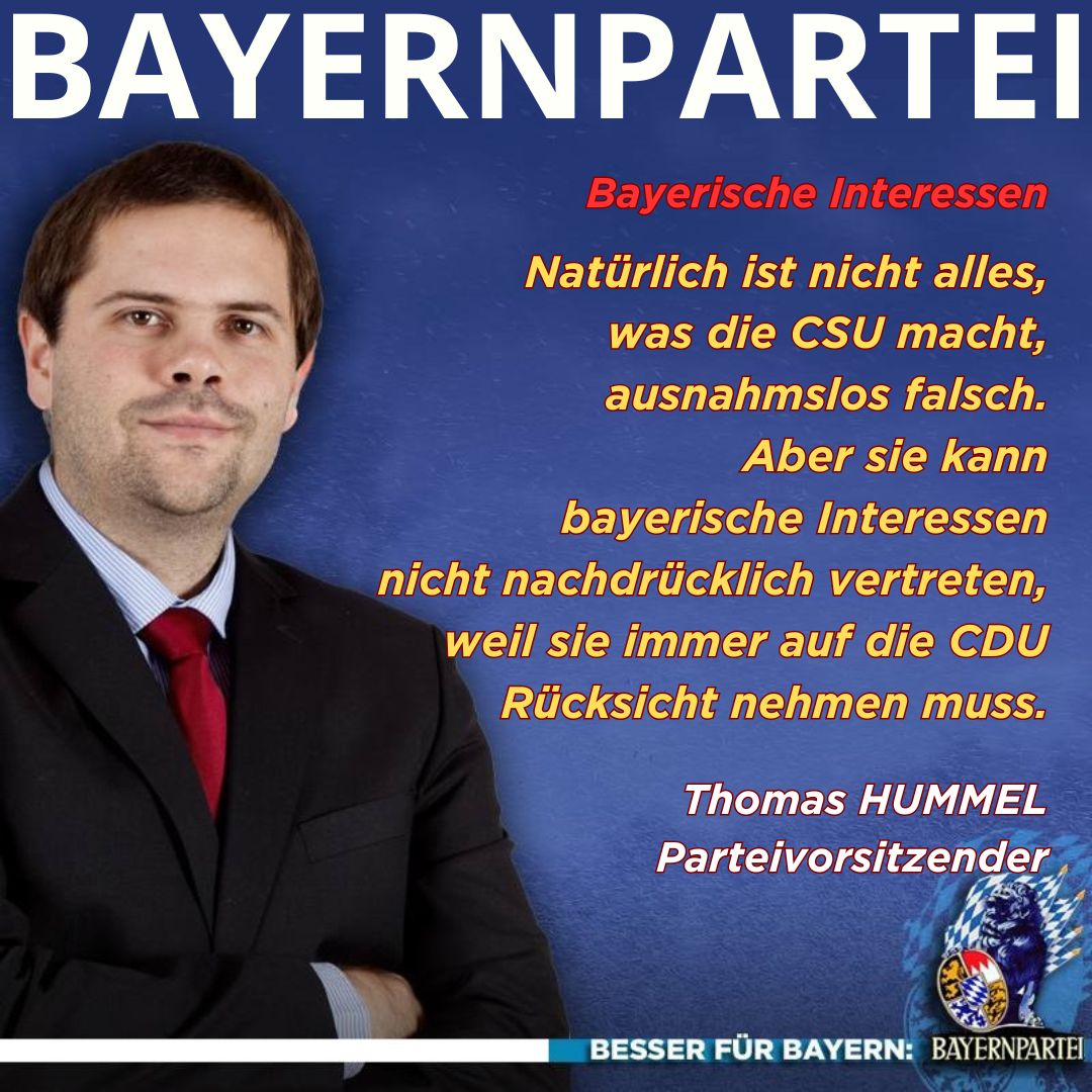 Thomas Hummel (Bayernpartei): Natürlich ist nicht alles, was die CSU macht, ausnahmslos falsch. Aber sie kann bayerische Interessen nicht nachdrücklich vertreten, weil sie immer auf die CDU Rücksicht nehmen muss.
