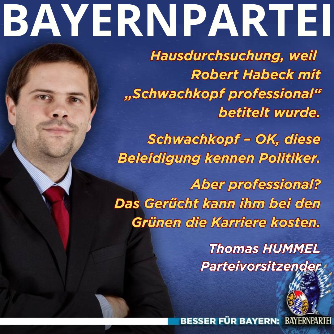 Thomas Hummel (Bayernpartei): Hausdurchsuchung, weil Robert Habeck mit „Schwachkopf professional“ betitelt wurde. Schwachkopf – OK, diese Beleidigung kennen Politiker. Aber professional? Das Gerücht kann ihm bei den Grünen die Karriere kosten.