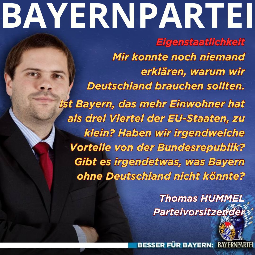 Thomas Hummel (Bayernpartei): Mir konnte noch niemand erklären, warum wir Bayern eigentlich Deutschland brauchen sollten. Ist Bayern, das mehr Einwohner hat als drei Viertel der EU-Staaten, zu klein? Haben wir irgendwelche Vorteile von der Bundesrepublik? Gibt es irgendetwas, was Bayern ohne Deutschland nicht könnte?